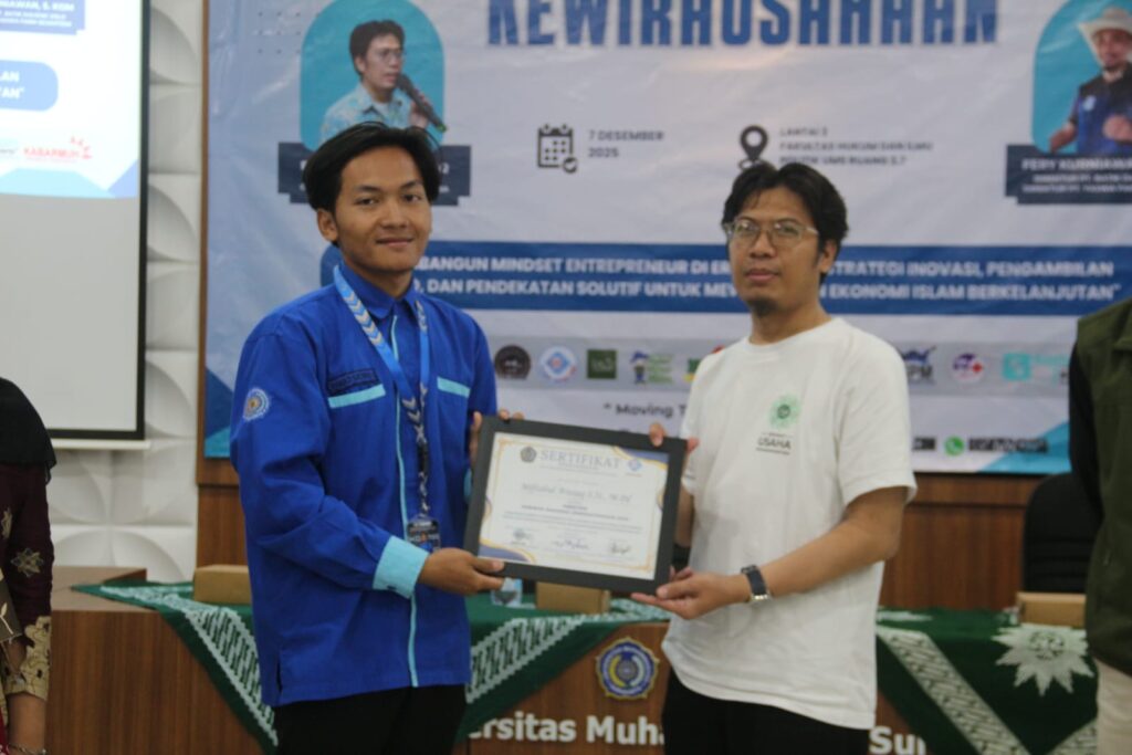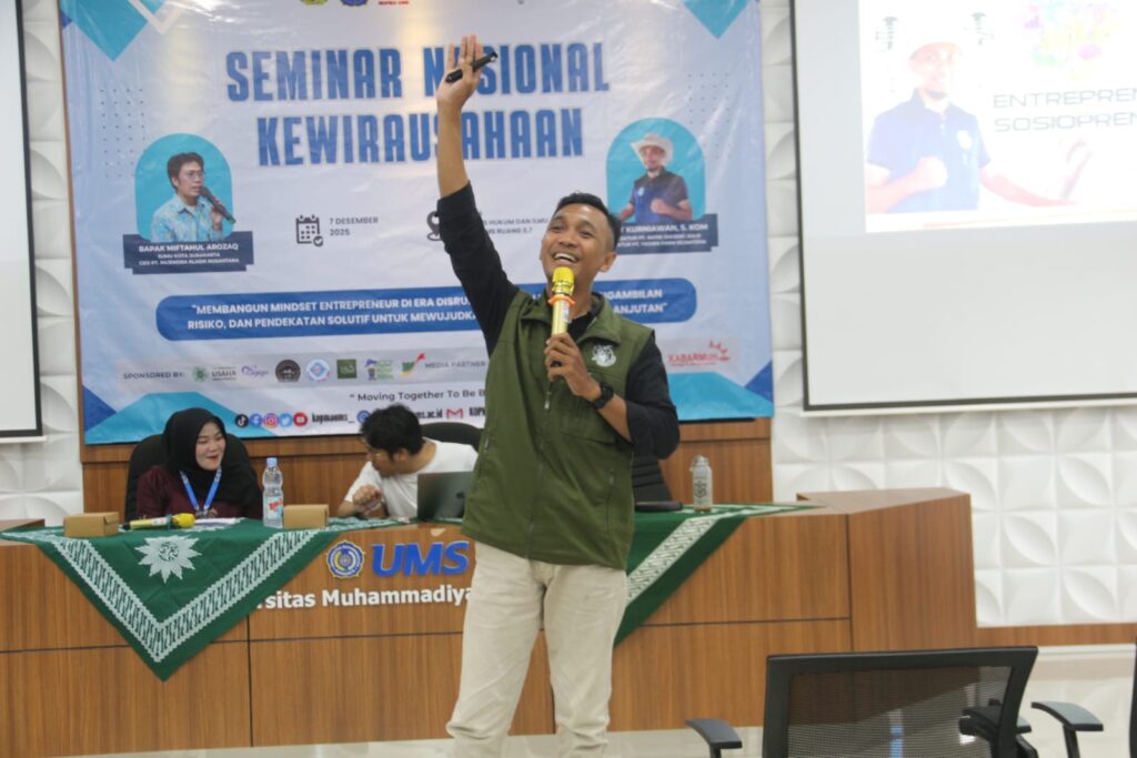 SURAKARTA – Koperasi Mahasiswa Universitas Muhammadiyah Surakarta (KOPMA UMS) menyelenggarakan Seminar Nasional 2025 sebagai upaya menumbuhkan pola pikir kewirausahaan di kalangan mahasiswa. Seminar bertema “Membangun Mindset Entrepreneur di Era Disrupsi: Strategi Inovasi, Pengambilan Risiko, dan Pendekatan Solutif untuk Mewujudkan Ekonomi Islam Berkelanjutan” ini digelar pada Selasa (9/12).